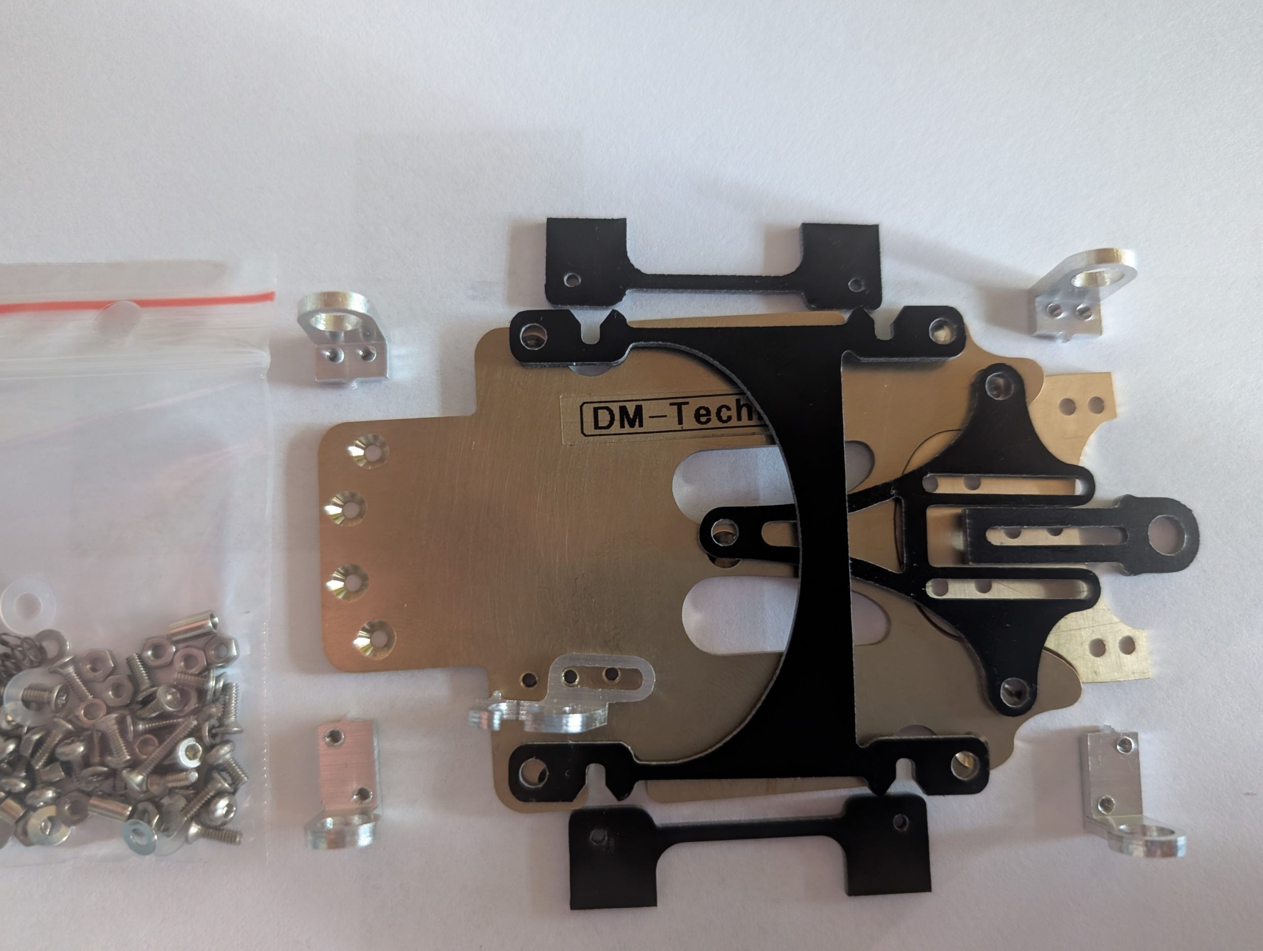 Chassi-Kit ist mit Anleitung, Karosseriehalter, Achsböcken, Motorhalter, Hülsen, Federn und Schrauben-Set.